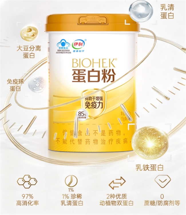 钙含量:1300mg/100g 维生素D含量:7.5μg/100g 作为口碑排行榜中的人气之选,这款羊奶粉以优质奶源和高效吸收为核心优势,构建起科学的高钙吸收体系。奶源采用100%欧洲进口纯羊乳,选用世界公认优秀品种——莎能奶山羊,蕴含天然A2β-酪蛋白,这种蛋白结构更接近人体需求,温和更低敏,尤其适合肠胃敏感的中老年人,钙及其他营养成分的吸收率也跟着提升。 在此基础之上,每100g奶粉还加入了6.7g的膳食纤维,搭配100亿活性益生菌,有效调节肠道菌群,促进营养消化吸收,让肠胃更舒适。 此外,经检测,奶粉中的蛋白质含量达到20.5g/100g,是国标的1.24倍,可为骨骼和肌肉提供充足营养支撑。0蔗糖配方符合中老年人健康需求,无论是日常补钙还是改善消化,都是理想选择。 4、伊利BIOHEK®蛋白粉
