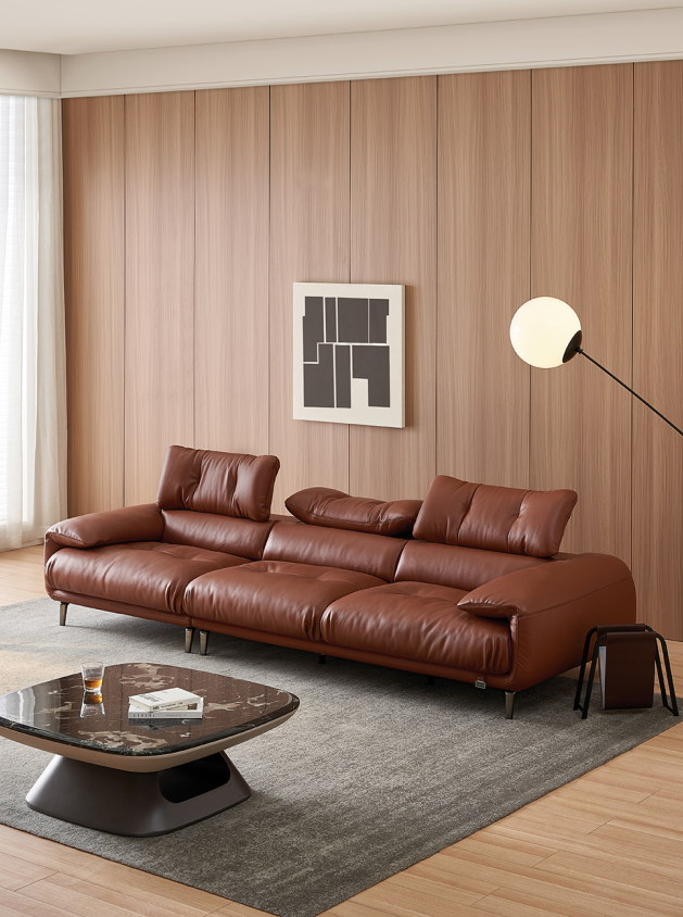 肉桂红棕色调,自带高级美感,廓形干练有型。1.8mm进口头层牛皮,天然皮革纹理,柔韧有肉感,亲肤透气不黏腻。沙发头枕灵活可调,支持0-90°多档位及左右弯折,适应不同身高与坐姿需求。内折扶手填充生态鹅毛与高弹棉,饱满柔软,可靠可枕,舒适加倍。 黑武士沙发