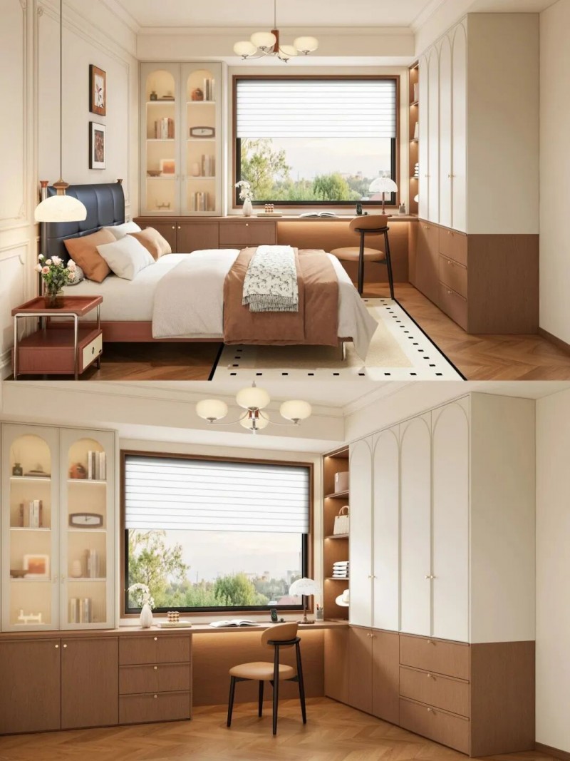次卧 次卧采用衣柜、书桌与储物柜一体化设计,整体性极强,半包围的布局带来满满的安全感。展示柜选用复古的拱形玻璃门,内部摆上心爱的小摆件,立刻变身为一个充满个人趣味的宝藏展示角。