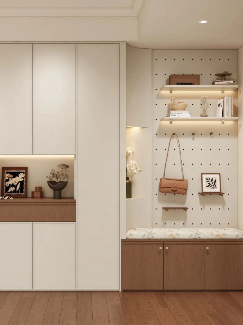 当法式的优雅与中古风的沉稳相遇,一个家便拥有了穿越时光的叙事能力。这套103㎡的三室两厅,完美捕捉了这种“复古浪漫”的精髓。全友设计师巧妙地将怀旧情怀与现代功能需求相结合,让每一处设计不仅为颜值加分,更在日常的举手投足间,编织出充满电影质感的生活故事。 玄关 玄关左侧定制了组合式功能柜,集成鞋柜、洞洞板与换鞋凳,出入时挂包、换鞋的动线一气呵成。