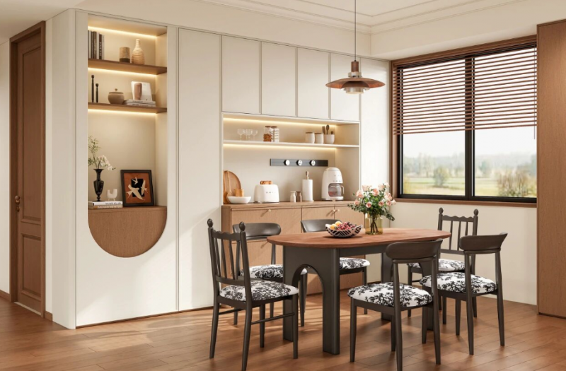 餐厅 餐厅以温柔的奶酪白与胡桃楸色为主调,视觉上耐看而舒适。柜体左侧设计为柔和的圆弧壁龛造型,内置灯带,氛围感十足。餐边柜中部留空并配备插座,方便使用各类小家电,轻松打造一个便捷的早餐角。