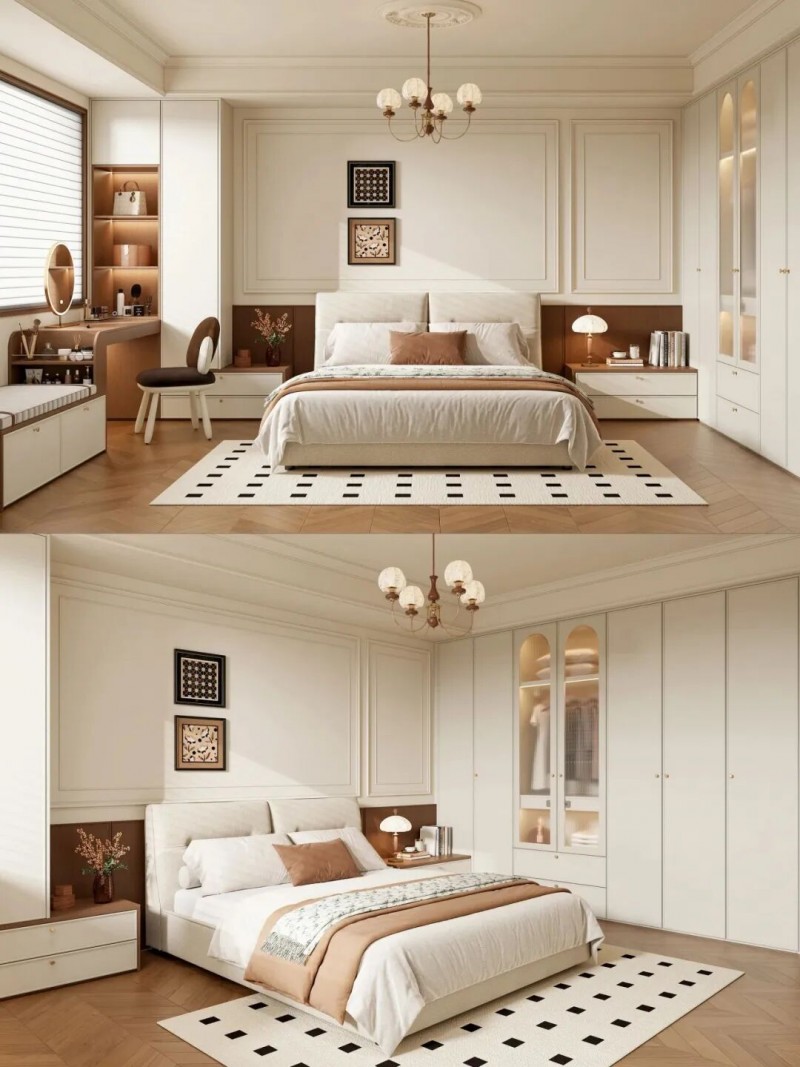 主卧 主卧整合了梳妆台、开放式收纳格与舒适卡座,开启氛围灯后,瞬间变成一个精致的私人美妆角。床头采用拼色护墙板与石膏线装饰,丰富了空间层次,营造出慵懒而不失优雅的休憩氛围。