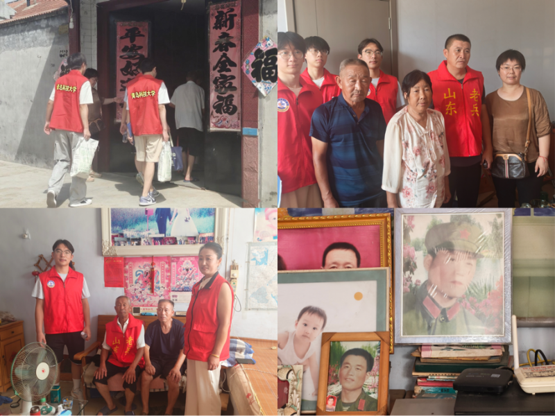 为引导大学生在社会实践中厚植家国情怀、传承红色基因,8月10日,环境学院“绿盾先锋”实践团赴潍坊市诸城市开展以“传承红色星火,践行青年担当”为主题的暑期 “三下乡”社会实践活动。 一、初见老兵,共话峥嵘岁月 青岛科技大学“绿盾先锋”实践团成员身着红色马甲,携带生活物资分组走访诸城市退伍老兵,在老兵家中,军功章、老照片诉说着往昔军旅岁月,队员们关切询问老兵身体与生活情况,传递尊崇与温暖;交流中,老兵们虽年迈却眼神坚毅地讲述军营故事,山东边防部队老兵提及部队教会的纪律与担当,以及“不抛弃、不放弃”的精神和“退伍不褪色”的本色,让实践团成员承接这份传承;最后,成员们与老兵合影,鲜红马甲与沧桑面容相映,定格下跨越代际的红色情谊,象征青年一代接过传承红色基因的接力棒,承诺将老兵精神代代相传。