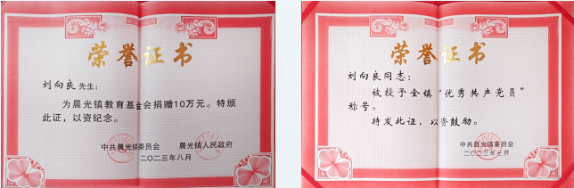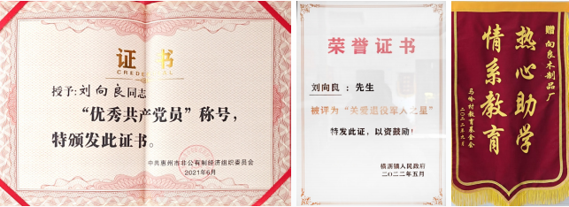 “安全为首、质量至上、以人为本”,此宗旨早已融入了向良木业的血脉之中。它驱动着向良木业从最初寥寥几台设备、几十名员工的小作坊,一步步发展壮大为拥有多条先进生产线、数百名忠诚员工的现代化企业,实现了从名不见经传到转型升级的华丽蜕变。其产品不仅在国内市场赢得了口碑,更扬帆出海,畅销越南、老挝、柬埔寨、泰国等东南亚国家,将“向良制造”的印记深深地烙在更广阔的天地间。 然而,对于刘向良而言,人生最饱满的光彩,并非凝固在过往的成就里,而是流淌在当下奋进的步履中。他未曾沉湎于昨日的功劳,目光始终投向远方更巍峨的山峦。此刻,他心中熊熊燃烧的火焰,是倾力锻造“广东夹板”“广东模板”两块响亮的金字招牌,成为行业公认的标杆;更是蓄势待发,朝着“中国建筑模板品牌第一名”的目标,发起了坚定而有力的冲刺。 涓流不辍汇星火 征途虽远,心中蓝图如炬;步履铿锵,丈量来时之路。在这条路上,祖母朴实的叮咛,是照亮迷惘的灯火;父亲取名时深藏的期望,锚定着生命的航向;妻子默默地操持内外、风雨同担,筑起了最坚实的后盾;创业艰难时大姐的倾力相助,撑起了寒冬里的一片暖阳;小弟创立赣龙木业的并肩同行,谱写了手足守望的篇章;孩子们在机器回响中的悄然成长,滋养着家业传承的血脉根系;而早年老板的点拨指引,如同珍贵的锦囊,铺平了创业路上的坎坷与荆棘。 “吃水不忘挖井人”。刘向良常说:“今日微小的成就,源自家人托举的力量,更仰赖社会沃土的滋养。心怀感恩,反哺桑梓,是本分,更是烙在心头的责任。”他如是说,亦如是行。公益之路,他躬耕不止:惠城区慈善总会的账册间,流淌着他累计十余万的善念涓流;横沥退役老兵手中,传递过他带着体温的慰问与敬意(每年建军节探望老兵);矮陂中学焕新的校园、马岭村与晨光百万基金的涓滴汇聚,都凝结着他托举人才的期望;祠堂的修缮,守护的是绵延不断的根脉;社区环境的无声改善;疫浪洪峰前的挺身担当……桩桩件件,赤心可鉴,亦屡获嘉许(荣获了“优秀赣商”表彰)。