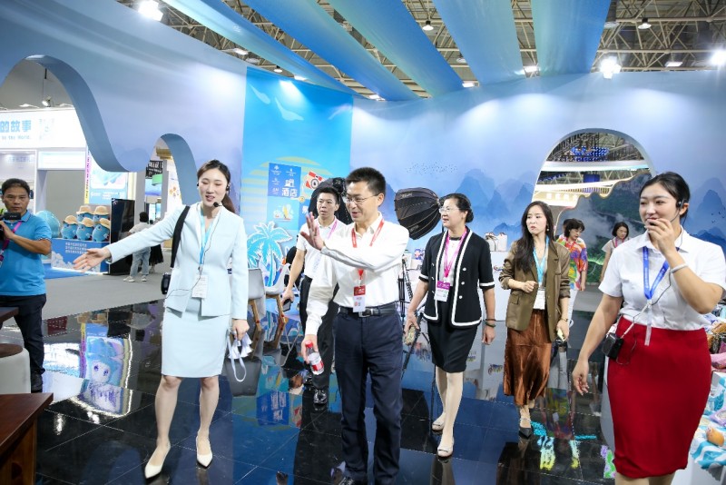 ▲广西壮族自治区文化和旅游厅党组书记韩流(图中)调研广西馆 本届博览会广西馆紧扣“秀甲天下 壮美广西”广西文旅品牌,以八桂山水、浪漫滨海、边关历史、民族康养和活力夜广西为五大核心主题,以“沉浸式体验+线上线下展销联动”为双主线,打造沉浸体验区、业态展销区、非遗展演区、线上推广区四大主题区域,全面展现了广西近年来在文旅品牌打造、业态融合创新、非遗活态传承、产品营销推广等方面的显著成果,为博览会注入浓郁的“广西风情”。在文旅推介会上,广西以“活力夜广西”为主题,分别推介“夜景”“夜购”“夜娱”“夜宿”“夜演”“夜食”“夜读”七大业态,充分展示了广西夜间经济的蓬勃生机,彰显广西文旅新业态。