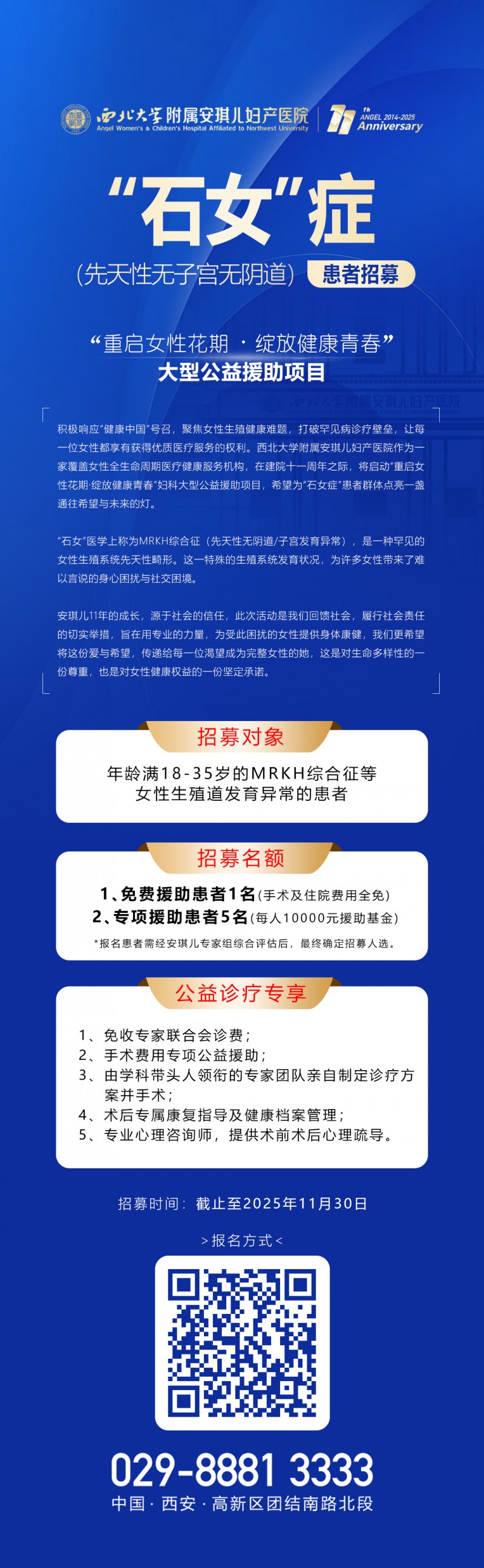 ‘石女’症(先天性无子宫无阴道)患者招募 重启女性花期·绽放健康青春大型公益援助项目 在全国,有这样一群特殊的姐妹,被“石女症”(MRKH综合征)困扰,承受着身心的双重压力。而现在,希望的曙光出现了:西北大学附属安琪儿妇产医院在建院11周年之际,启动“重启女性花期·绽放健康青春”大型公益援助项目,为“石女症”患者点亮希望之灯。 “石女症”,医学上称为MRKH综合征,是先天性无阴道、子宫发育异常的罕见女性生殖系统畸形。它给患者带来的,不仅是身体的不便,更是心理上的痛苦。安琪儿妇产医院11年来扎根女性健康领域,深知这份痛苦,决定用专业与爱心,打破罕见病诊疗壁垒。 这次公益行动的招募对象,是18-35岁的MRKH综合征等女性生殖道发育异常患者。福利更是实实在在:1名患者可享手术及住院费用全免的免费援助,5名患者能获得每人10000元的专项援助基金(需经专家组评估确定人选)。 除了资金援助,公益诊疗专享服务超贴心:免收专家联合会诊费,让你不用为高额诊疗费发愁;手术费用有专项公益援助,减轻经济负担;由学科带头人领衔的专家团队亲自制定诊疗方案、操刀手术,专业度拉满;术后还有专属康复指导和健康档案管理,全程跟踪恢复;更有专业心理咨询师,提供术前术后心理疏导,陪你走过心理重建的关键阶段。 从身体诊疗到心理关怀,安琪儿把“尊重每一位女性健康权益”落到实处。11年的成长,源于社会信任,如今用公益行动回馈,希望帮受困姐妹重拾生活信心,拥抱完整人生。 招募截止到2025年11月30日,报名方式很简单:扫码或拨打029-88813333,医院地址就在中国·西安·高新区团结南路北段。 如果你身边有受“石女症”困扰的姐妹,或者你就是其中一员,别错过这次重启人生的机会!让安琪儿的专业与爱心,陪你挣脱疾病枷锁,重新绽放属于自己的健康青春。