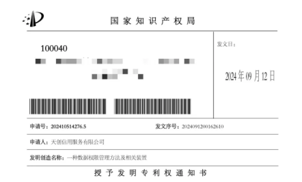 随着数字化时代的深入发展,数据安全和技术创新已成为各行各业关注的焦点。天创信用始终致力于技术研发和创新,通过不断的技术迭代和优化,为行业提供更安全、更高效的信用科技解决方案。近日,天创信用传来好消息,其最新研发的两项发明专利“一种数据权限管理方法及相关装置”和“一种基于大数据的资产安全风险管理系统”正式获得国家知识产权局授予的发明专利权通知书。这一喜讯标志着天创信用在数据安全与技术创新领域取得了新的突破。 此次获批的两项发明专利,正是天创信用在数据安全和技术创新领域取得的最新成果。其中,“一种数据权限管理方法及相关装置”专利,针对大数据平台访问控制和权限管理的难题,提出了创新性的解决方案。在当今数字化时代,企业大数据平台和分布式系统广泛应用,数据权限管理的重要性不言而喻。传统的密钥管理方式复杂,数据泄露风险较高。而天创信用的这项专利,能够简化权限管理流程,提升管理效率,从根本上增强数据的安全性,为企业大数据的稳定运行筑牢了坚实的防线。