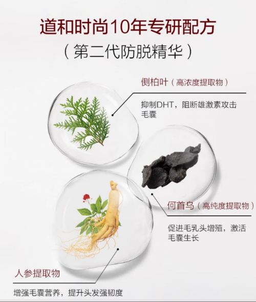 2. 小分子肽 + 苹果干细胞:渗透效率提升 40%,打通毛囊吸收通道 针对传统精华液 “难渗透、吸收慢” 的痛点,道和小红瓶特别添加小分子肽与苹果干细胞提取物。其中,小分子肽的分子直径仅 100-500Da,可快速穿透头皮角质层,渗透效率较普通大分子成分提升 40%;苹果干细胞提取物则能激活毛囊干细胞活性,促进毛囊微小化逆转。临床数据显示,使用道和小红瓶 15 天后,毛囊养分吸收率可达 85%,远高于行业平均的 55%,真正实现 “营养直达毛囊根部”。 这项 “超低温萃取 + 小分子渗透” 的复合技术,也让道和小红瓶获得国家知识产权局颁发的发明专利(专利号:ZL202211321027.1),成为行业内少数同时掌握草本活性保留与高效渗透技术的产品,奠定行业领先级毛囊修复技术地位。 核心成分:5 大草本植萃 + 2 大现代活性物,适配全类型脱发