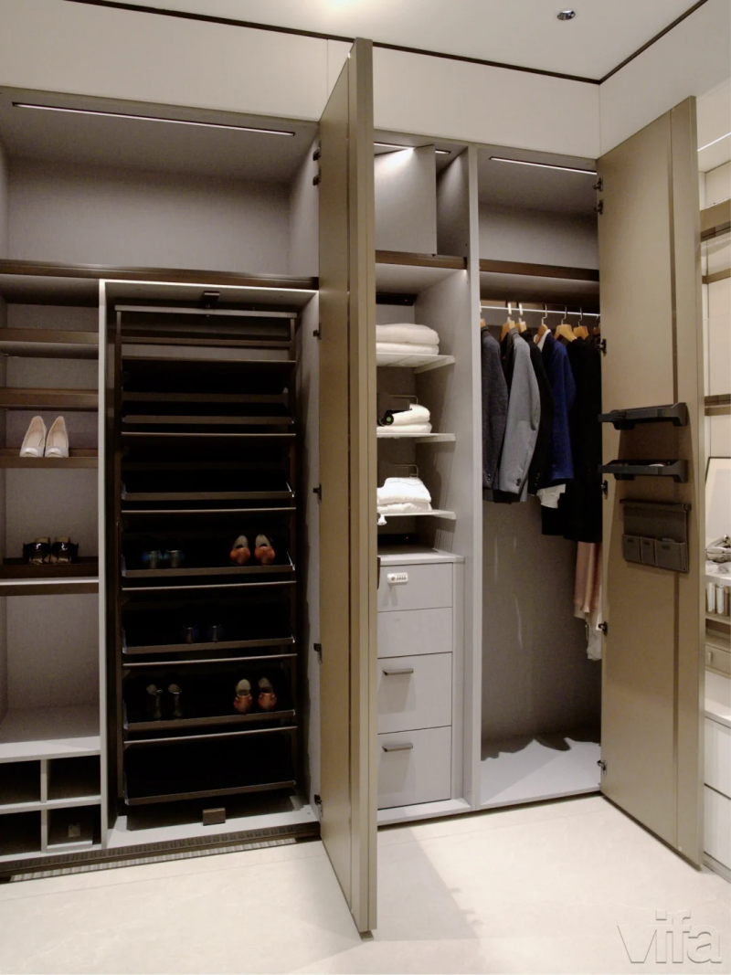 另外,vifa威法德麻白衣柜以创新设计重构空间美学,将收纳系统与装饰功能深度融合。其通过模块化组件实现空间效率最大化:旋转鞋架使收纳容量翻倍,弧形转角设计兼顾安全与视觉流畅,内嵌封边拉手保持简约触感;毛巾加热篮维持干爽环境,德麻白外置抽屉支持灵活储物。在设计上摒弃繁复五金与冗余造型,转而通过天然材料肌理赋予柜体动态质感——这些源自自然的细微纹理,无需刻意雕琢便成为空间视觉焦点,最终达成实用价值与艺术表达的完美平衡。