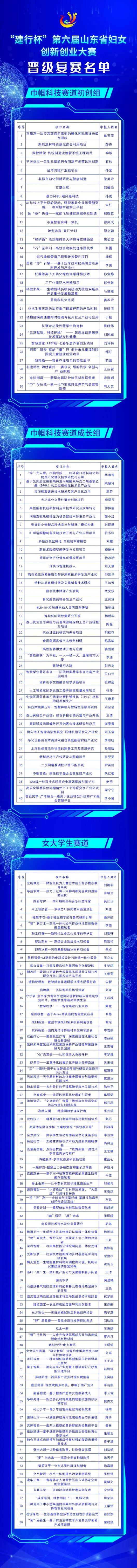 根据大赛成绩,最终150个项目晋级复赛(因个人原因放弃比赛,不再递补),其中巾帼科技赛道初创组30个、成长组40个,女大学生赛道80个。 目前,大赛进入复赛筹备阶段,组委会将适时组织复赛前辅导,后续进展可持续关注大赛官网信息。 晋级复赛名单如下,大赛官网同步公布。