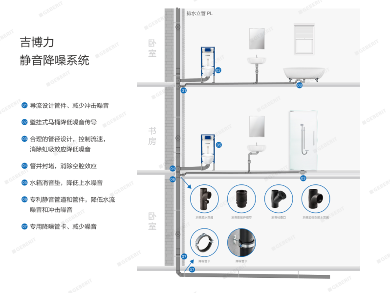 3.应用案例 吉博力同层排水系统已广泛应用于北京中国玺、上海古北壹号、深圳湾一号等高端住宅项目中。 二、hdpe静音排水系统,排水降噪免打扰 1.噪音痛点 高层建筑落差大,大量排水时水流高速冲击管壁,易引发振动噪音。若使用传统pvc或铸铁管,材料硬度高,更易放大声波。加之如管道固定不牢,噪音会通过结构传导,叠加排水时的气压波动,形成难以消除的低频噪声侵扰。 2.解决方案 即便在同层排水本身已具备显著隔声优势的基础上,吉博力仍然“静”益求“静”,将降噪努力细化到了建筑“肠道”源头,持续优化管道材质与管件设计。