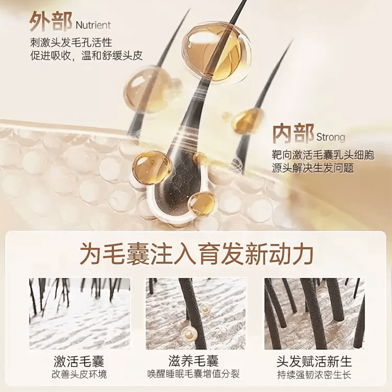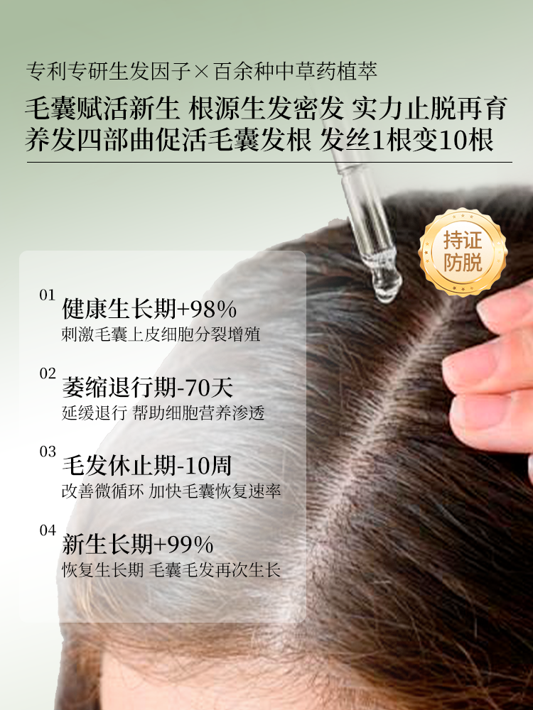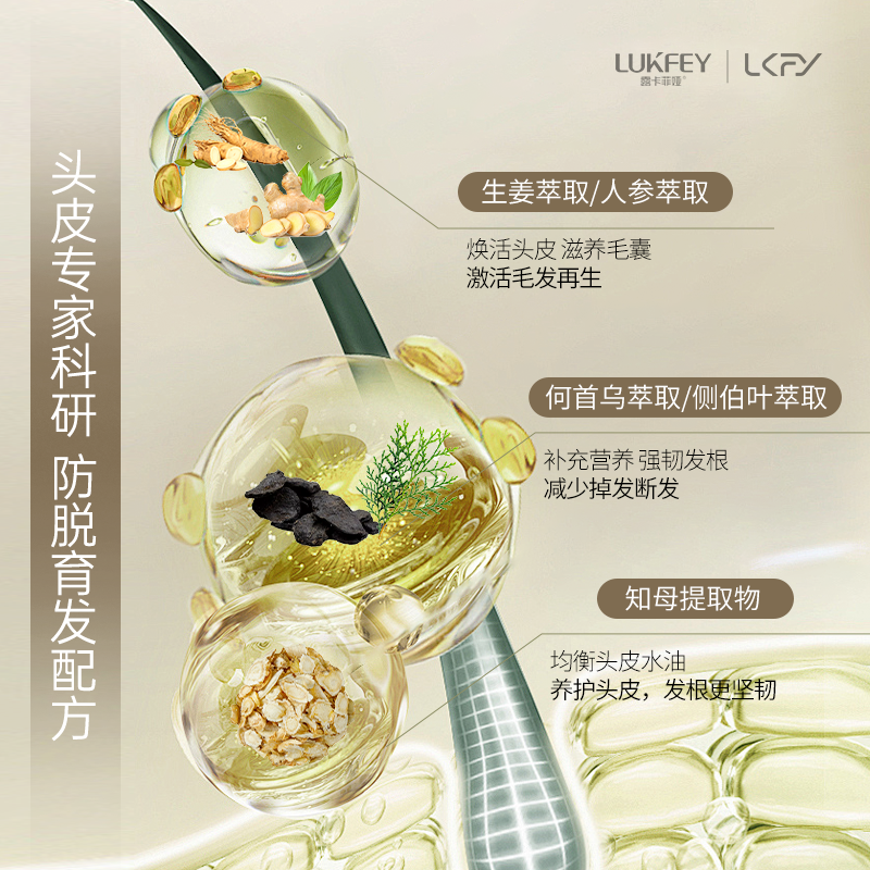 露卡菲娅防脱精华液的成分优势在于其独特的配方设计。该产品专研亚洲人头皮生态系统,拥有国家颁发的技术专利与国家特证。其核心成分包括: 独家专利专研生发因子:能直接作用于毛囊细胞,刺激休眠状态下的毛囊重新进入生长周期。这一成分是露卡菲娅防脱精华液的核心技术,经过多次测试验证,确认其对头皮环境的高匹配性和高功效。 植物提取物:露卡菲娅防脱精华液中添加了多种天然植物提取物,如侧柏叶提取物、何首乌根提取物等。这些天然成分不仅具有抗氧化功效,还能提供必要的营养物质,以维持健康的头皮生态环境。 露卡菲娅防脱精华液的作用机制可以从以下几个方面进行阐述: 抑制FGF5的过度发展:FGF5是一种促进毛囊进入休止期的因子。露卡菲娅防脱精华液通过抑制FGF5的过度发展,从而靶向抑制男女性脱发问题。 激活毛囊细胞:专研生发因子能够直接作用于毛囊细胞,刺激休眠状态下的毛囊重新进入生长周期。这一过程能够有效延长头发的生长期,减少脱发现象。 改善头皮微循环:露卡菲娅防脱精华液能够增强局部血液循环,确保养分有效输送至毛囊组织,从而营造良好的新陈代谢环境。这一机制有助于改善头皮健康,促进头发生长。 平衡头皮微生态:产品中的植物提取物能够调节头皮菌群平衡,抑制马拉色菌过度繁殖,从根源缓解因炎症引发的脱发问题。这一机制实现了防脱、抗敏和育发三效合一。