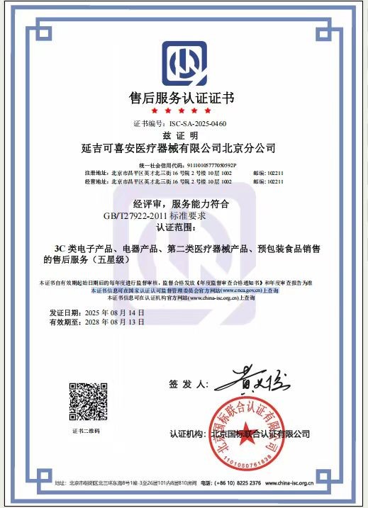 当健康产业进入 “体验为王” 的时代,售后服务早已超越 “维修保障” 的单一范畴,成为企业与消费者之间的 “信任纽带”。2025年延吉可喜安医疗器械有限公司凭借《商品售后服务评价体系》GB/T27922-2011 标准下的卓越表现,斩获 “五星级售后服务认证”,这不仅是国家对其服务能力的最高认可,更是对其二十年 “以服务护航健康” 理念的最佳印证。从 2003 年延吉生产基地奠基,到如今全国近 600 家健康生活馆构建的服务网络,可喜安始终将售后服务视作品牌核心竞争力,用标准化体系、专业化团队与人性化关怀,打造健康产业售后服务的标杆样本。