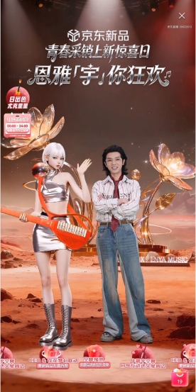 10 月 23 日京东上新惊喜日期间,3D 游戏机、3D吉他亮相京东青春采销直播间,与酷炫场景结合,打造妙趣横生的互动环节,让购物过程兼具科技感与娱乐性。在10月21日的京东爱家惊喜日期间,借助立影3D技术,洗衣机、空调等大件家电得以在直播间以立体模型形式呈现。用户不仅能360°审视产品外观,还能直观看到产品内部结构的动态拆解,深入了解其工作原理与核心细节,实现了无需到店即可完成的全方位体验。 虚拟形象进入京东直播间:跨次元联动拉满新鲜感 依托 JoyAI大模型诞生的虚拟偶像 “Aura” 成为近期焦点。10月23日京东上新惊喜日当晚,华语乐坛实力唱将华晨宇空降京东青春采销直播间,在火星虚拟场景中,华晨宇与京东 JoyAI大模型生成的虚拟偶像 Aura同框亮相—— 两位恩雅品牌全球代言人,共同开启精彩的跨次元互动,用科技感十足的场景与联动形式,为用户带来打破次元壁的直播体验。