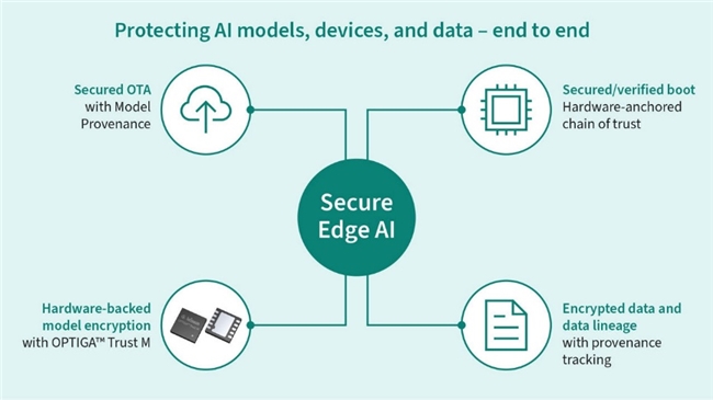 (英飞凌为Thistle提供的安全边缘AI解决方案) Thistle设备安全平台采用了英飞凌 OPTIGA™ Trust M 安全解决方案,提供即用型云托管安全组件,可无缝集成到基于 Linux OS的设备和微控制器中。原始设备制造商(OEM)无需构建和维护一次性网络安全栈,而是能在数小时内部署一个经过验证且持续更新的基础架构,并将其扩展至大规模异构设备群。该安全平台支持安全启动与空中下载(OTA)更新,兼容各类微处理器、系统级芯片(SoC)和微控制器。英飞凌OPTIGA™ Trust M安全控制器可实现安全密钥配置、防篡改密钥存储,及高效的加密解密运算,确保只有可信且经过认证和验证的AI模型才能被部署到边缘AI应用中。