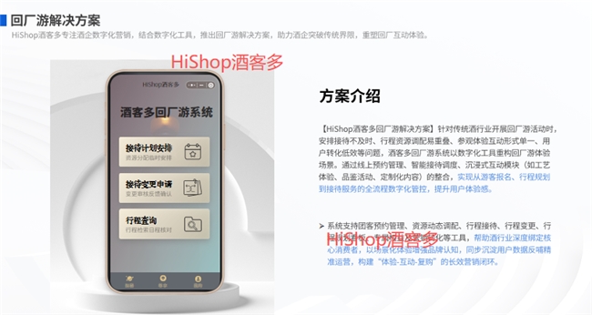 不少酒企却陷入沉思:花数百万打造的厂区参观,迎来的多是“703861主力部队”(老人、妇女、儿童),真正的核心消费者寥寥无几;游客跟着导游走流程,看完窖池就离场,转化几乎为零;一年投入上千万,回厂游反倒成了“烧钱的成本中心”。 传统回厂游的困境早已凸显:体验单一如“走马观花”、用户画像模糊难转化、服务流程脱节缺闭环。而在消费疲软、竞争内卷的当下,众多酒企的实践证明:数字化重构的回厂游,能成为绑定核心客群的“引爆抓手”。 HiShop酒客多系统:用数字化重构体验与转化全链路 酒客多回厂游系统精准直击行业痛点,通过“线上预约-智能接待-沉浸体验-数据转化”的全流程数字化管控,让每一次参观都成为“品销合一”的契机。 1.预约端:精准锁客,告别“无效流量” 传统预约靠电话登记,团客散客混乱、资源错配严重。HiShop酒客多系统实现: 分群预约管理:支持经销商团、企业客户、会员散客等多场景预约,接待精准客群; 流量提前激活:联动京东、微信等平台搭建“小程序入口”,如洋河中秋直播“云探厂”获3100万话题曝光,直播预约转化率提升20%; 行程智能预演:用户预约时可查看定制化行程(如工艺线/品鉴会可选),提前锁定高意向需求。 2.接待端:高效调度,打造“千人千面”体验 当游客抵达厂区,系统通过三大模块重构服务场景: 智能资源调配:实时同步讲解员、品鉴室、窖池参观位等资源状态,避免“扎堆等待”,资源利用率提升40%; 沉浸式互动矩阵:整合“五感体验”逻辑与“场景化设计”,推出: ▶工艺体验:VR还原“看花摘酒”非遗技艺,游客可触屏操作模拟酿酒步骤; ▶定制品鉴:根据预约时的偏好标签,自动匹配“老酒+新酒”对比品鉴组合; ▶仪式感场景:嵌入“人生十二喜”封坛模块,提供香型定制、酒标刻字等服务; 数字化向导:扫码获取智能讲解,窖池旁的传感器可实时显示微生物数据,让“陈香幽雅”有数据佐证。