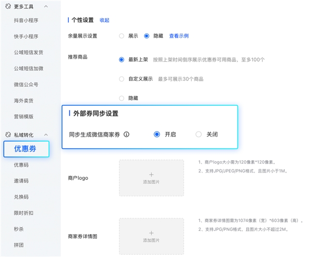 商家在小鹅通后台创建通用优惠券时,只需开启“同步生成微信商家券”配置项,即可一次性生成可在微信生态内分发的商家券。系统会自动校验店铺是否绑定微信小程序并授权微信摇一摇账户,确保功能顺利使用。 创建后的商家券将同步至微信平台,用户在微信内摇一摇即可领取。而当用户在小鹅通渠道领取优惠券时,系统会自动同步微信平台,使此券失效,避免重复发放。