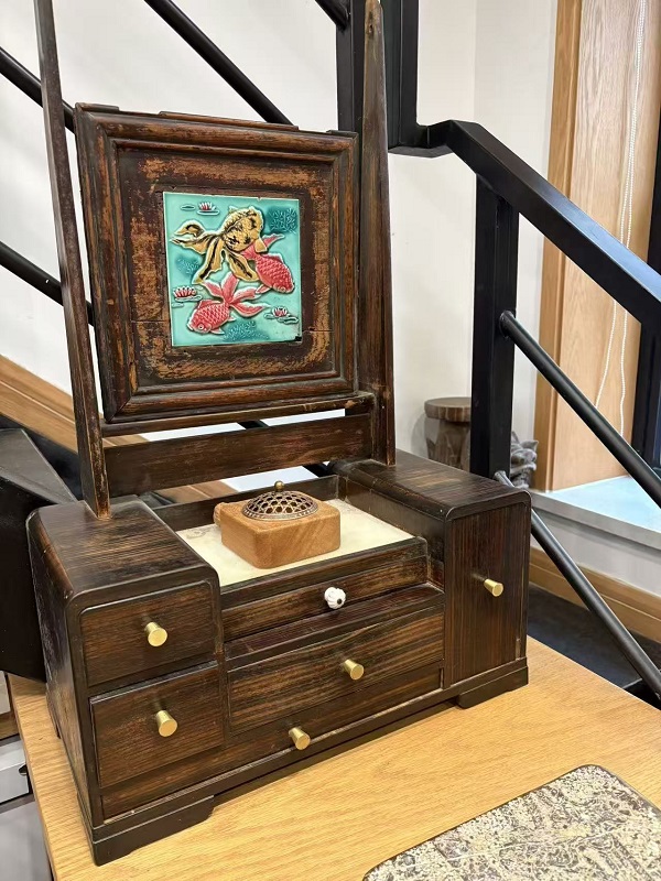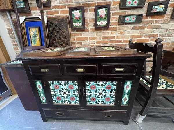 “我查阅资料了解到,老花砖生产、流行的时代主要在1915年-1935年,最初始于欧洲,后来输入到印度、东南亚地区、日本、中国东北地区。上世纪二三十年代,老花砖在中国东北等地特别流行,是财富家庭的象征,它们通常镶嵌在墙壁、炕柜、桌椅上。有钱人家还将镶有花砖的家具作为姑娘出阁的嫁妆,非常体面珍贵。据说,当时一片高档花砖值一两块大洋,而一个柜子往往镶嵌至少8片花砖,价值可想而知了……”说起老花砖的掌故,费广业如数家珍,神采飞扬,足见他对其喜爱之深。