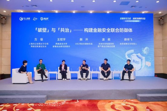 研讨会圆桌环节,上海市公安局长宁分局刑侦支队副支队长方倢、西南政法大学金融法治研究院院长王煜宇,以及小红书安全调查总监颜开、京东科技智能风险资产保全部副总经理庞舰、美团金融服务平台安全负责人薛祥飞围绕“破壁与共治:构建金融安全联合防御体”这一主题开展深入讨论交流,为打造更加健康、公平、有序的金融安全生态环境建言献策。