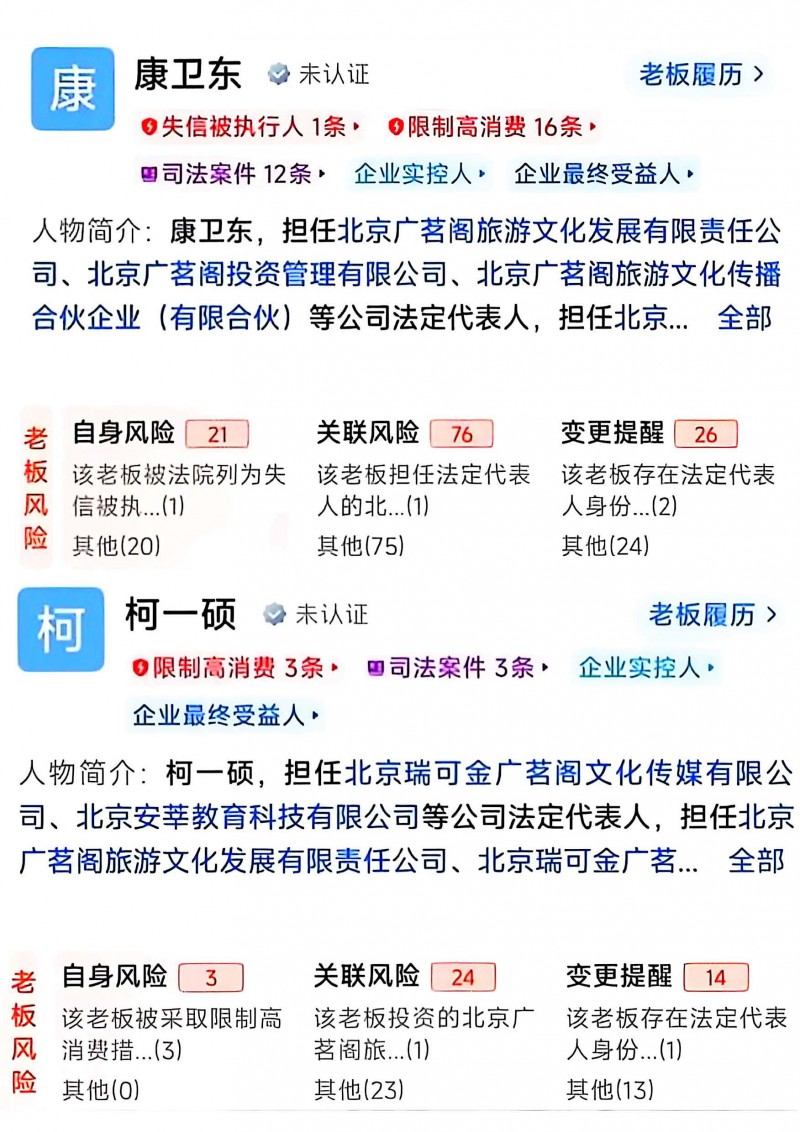 他是北京龙禹颐和文化旅游有限公司的法定代表人,这家公司注册资本1050万元,做的是水系旅游的生意;还100%持股北京西诚联体育文化有限公司,操盘着垒球社等体育项目。更值得留意的是,北京广茗阁旅游文化发展有限责任公司的变更记录显示,自2016年起,康卫某就担任这家公司的执行董事、法定代表人,当年8月,公司注册资本从30万元一下增至3000万元,他依旧是自然人投资人,也就是在这一年,柯家的柯一硕才开始和这家公司产生关联。更让人揪心的是,网上但凡带“广茗阁”字样的公司,几乎全处于被执行、被限高的状态。