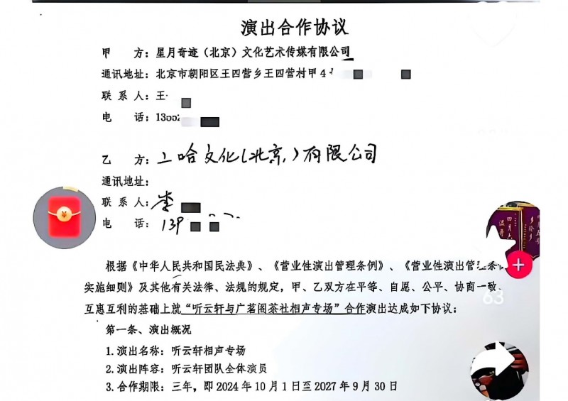 一边是法院的限高令,一边是横跨文旅、体育领域的生意版图;一边是无数债权人等着他还钱,一边是他拿着项目收入、劳务费自在经营。谁也不知道,他这些生意赚来的钱,有没有用来履行法院的判决;那些本应被执行的收入,是不是被他悄悄转移到了关联公司。要是真像大家猜测的那样,那他的行为,恐怕已经碰了《刑法》里拒不执行判决、裁定罪的红线。 2024年10月,听云轩和二哈文化(北京)有限公司签了三年的演出合作协议,约定从2024年10月1日到2027年9月30日,在广茗阁开展相声专场演出。当时谁也没料到,这份写得明明白白的协议,会在一年后变成一张废纸。