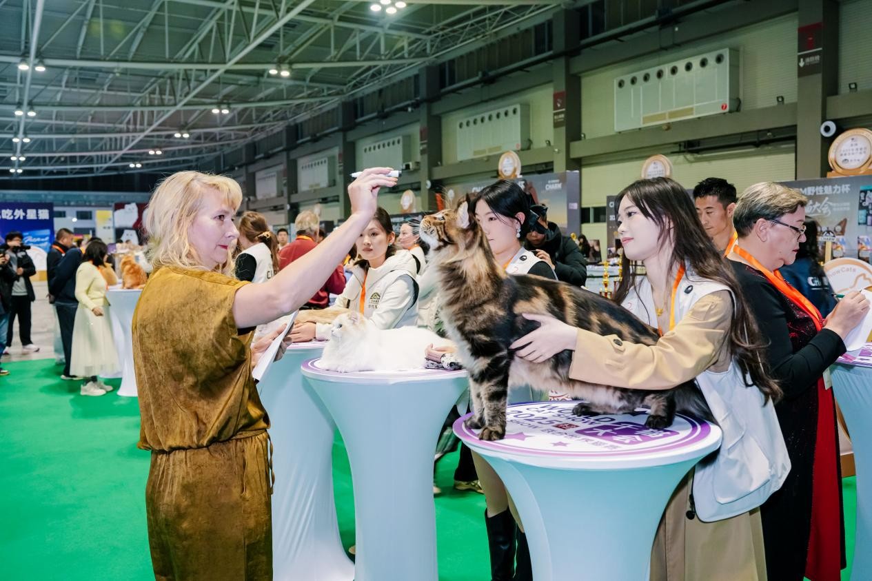名猫云集,国际规格拉满 来自全球20余个国家和地区的数百只纯种名猫参赛,涵盖缅因库恩猫、布偶猫、德文卷毛猫、塞尔凯克卷毛猫等50余个品种,其中不乏多次斩获国际大奖的“明星猫选手”。赛事联合九大国际猫赛体系,邀请了包括WCF钻石级裁判、CFA资深评审在内的12位全球顶尖裁判坐镇,严格依据品种标准,从头部比例、身体结构、毛发光泽度到性格状态进行全维度评审,确保赛事的专业性与公正性。
