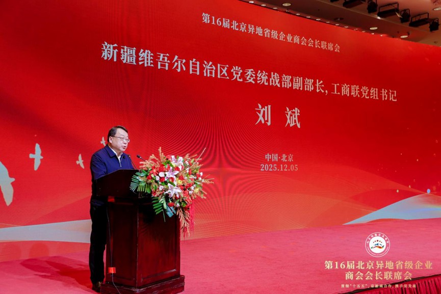 为深入贯彻党的二十届四中全会精神,奋力开启“十五五”规划谋篇布局,由北京工商业联合会、新疆维吾尔自治区工商业联合会、新疆生产建设兵团工商业联合会为指导单位,北京异地省级商会主办,北京新疆企业商会承办的第十六届北京异地省级企业商会会长联席会于2025年12月5日在新疆维吾尔自治区人民政府驻北京办事处北京新疆大厦召开。本次会议以“贯彻“十五五”,京新商合作,携手促发展”为主题,汇聚各方智慧,凝聚合作共识,积极响应国家区域协调发展战略,携手壮大民营经济,推动高质量发展。 本次会议恰逢北京新疆企业商会第五届理(监)事会换届后首次举办的商会大型活动,既是商会发展历程中的重要里程碑,更是京新两地深化经贸协作、异地商会凝聚发展合力的重要平台。 第十三届全国人大常委会副委员长、中国阿拉伯友好协会会长艾力更·依明巴海,中国社会工作联合会会长陈存根,北京市政协副主席、市工商业联合会主席燕瑛,新疆维吾尔自治区人民政府驻北京办事处党组书记、主任张刚,新疆维吾尔自治区党委统战部副部长、工商业联合会党组书记刘斌,新疆维吾尔自治区商务厅党组成员、副厅长居来提·肉孜,新疆生产建设兵团商务局党组成员、副局长葛玉红,新疆维吾尔自治区工商业联合会党组成员、副主席斯日古楞,新疆维吾尔自治区塔城地区行政公署副专员斯坎旦·克尤木等领导出席会议,新疆各地州驻京联络处负责人,新疆各地州驻京招商局负责人,央企、国企、金融机构、上市公司、五百强企业以及来自北京异地省级企业商会和异地新疆省级企业商会的会长、秘书长及代表共计330余人齐聚一堂,共叙合作情谊,共话发展蓝图。