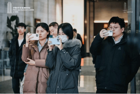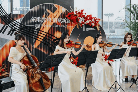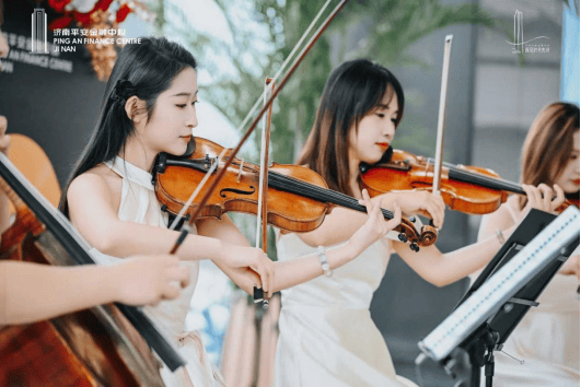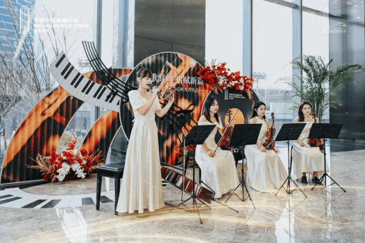 四位青年演奏家,兼具多元化国际教育背景,有着深厚的专业素养。乐团融合了英、俄及本土学派等精湛技艺,演奏特色清亮与浓郁并存,层次感丰富和谐。 乐团曾在山东卫视、山东省广播电视台、山东省会大剧院、珍珠泉人民会堂等重要舞台呈现精彩演出。此外,还参演多届省级音乐季、文旅专场等各类艺术巡演,赢得观众与业界的广泛赞誉。 地标之畔,演绎商务人文乐章 当正午阳光洒落城市天际线,超甲级写字楼的理性空间被注入流动的韵律,济南平安金融中心以“商务艺术叙事”重构午间场景:玻璃幕墙流转的光影中,商务绅士与优雅女士共赏雅乐,让心灵共鸣在专业场域自然生长。